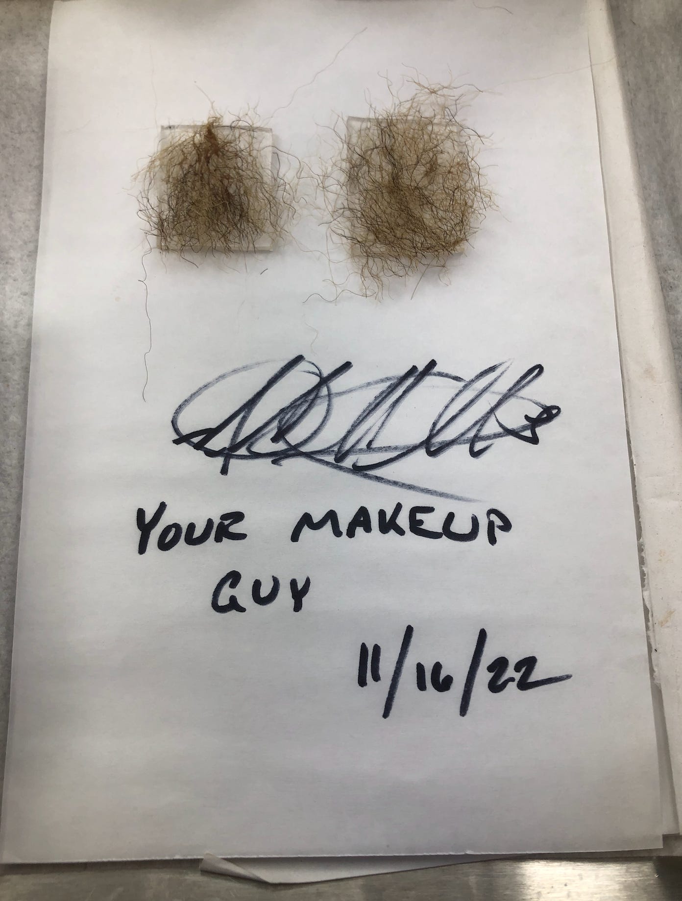 Before long, I was summoned to my trailer. Yes, my trailer. With my name on it. Spelled correctly—in black ink atop blue tape. The trailer had a bathroom and a couch and, dangling from hangers in a closet, my wardrobe for the day. My scene takes place in 1981, so I was outfitted in a groovy blue polyester shirt, beige slacks and a leather jacket that weighed about 12 Fluties. I changed, then shuffled over to the makeup trailer, where I assumed they’d look at my high cheek bones, my sparkling blue eyes, my iridescent skin tones and bellow, for all to hear, “Perfection!”