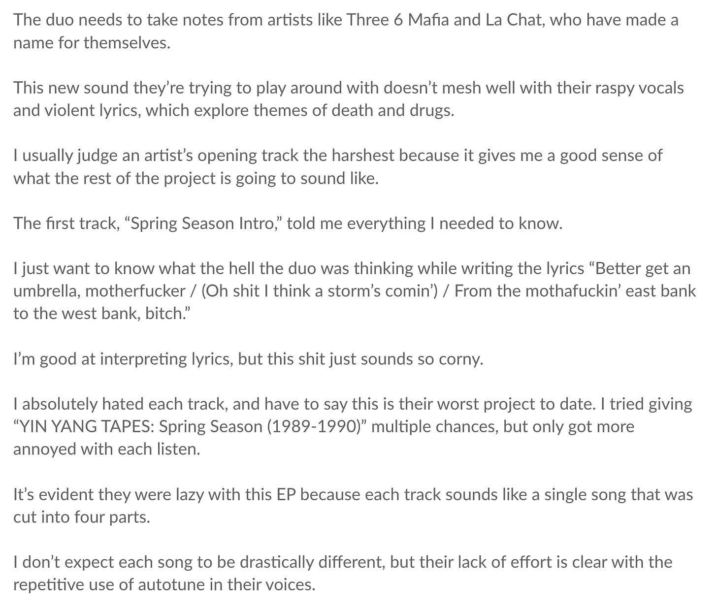 So I was just goobering around the Internet, seeking out this week’s student journalist, when I came upon Vanessa’s piece, $SUICIDEBOY$ EP IS A MASSIVE FAILURE. The article was written several months ago, and I couldn’t find Vanessa on Facebook, Twitter or IG. But … I’m 100-percent here for the bluntness of your prototypically awesome this-shit-sucks college newspaper music review.