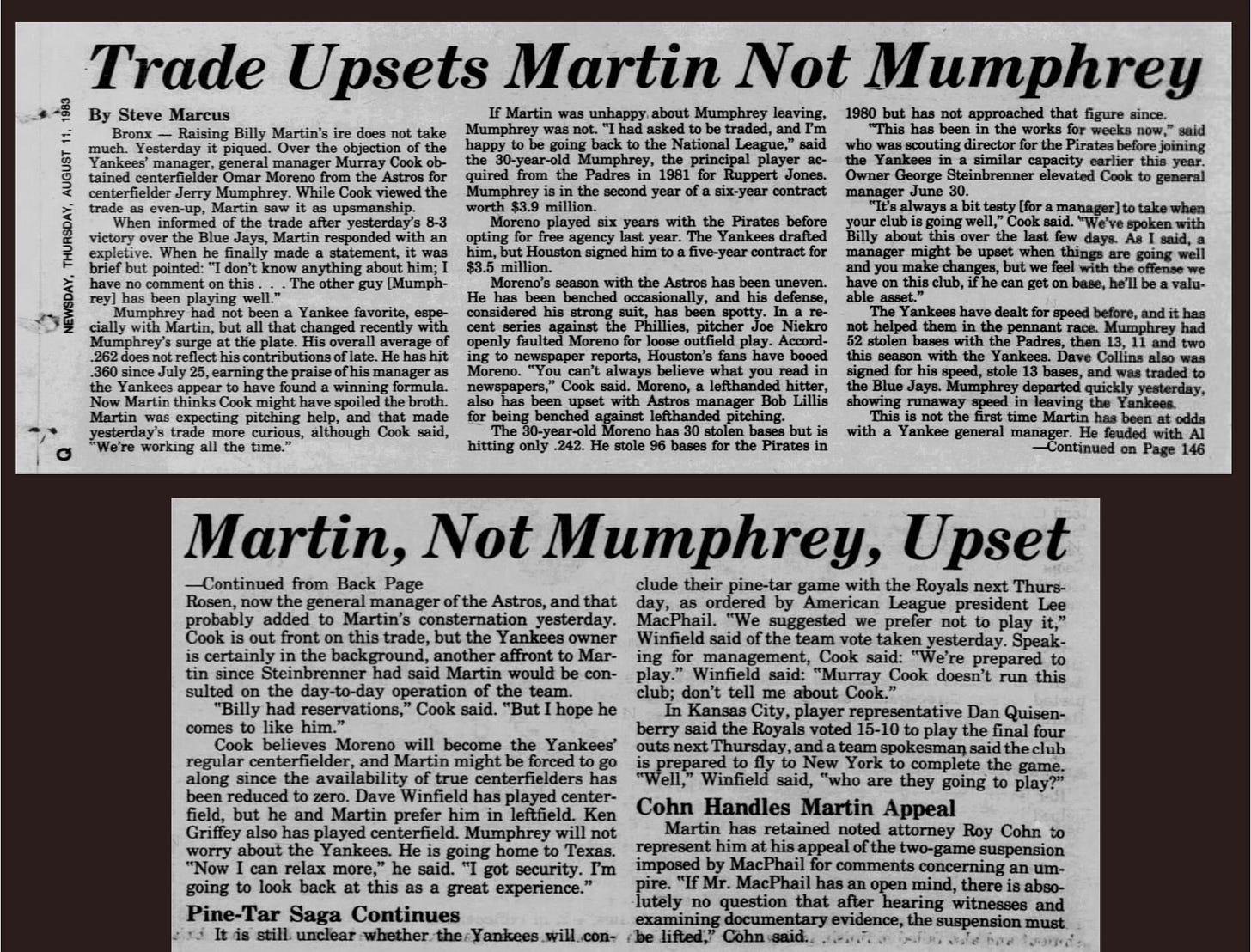 On. Aug. 10, 1983, the Houston Astros traded outfielder Omar Moreno to the New York Yankees in exchange for Jerry Mumphrey, also an outfielder. The deal exploded my 11-year-old head—and apparently infuriated Yankee manager Billy Martin. Steve Marcus of Newsday broke it down …